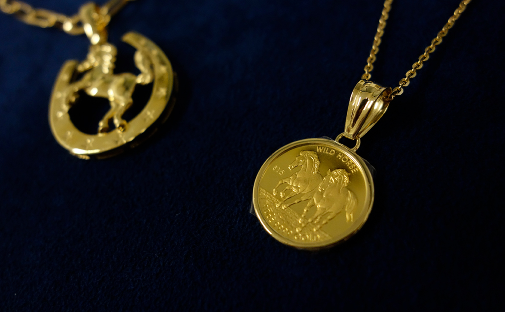 幅広・大振りのチェーンにも対応可能なペンダントトップ。通すチェーンによって違った雰囲気をお楽しみいただけます。馬蹄(K18)コイン(K18/K24)