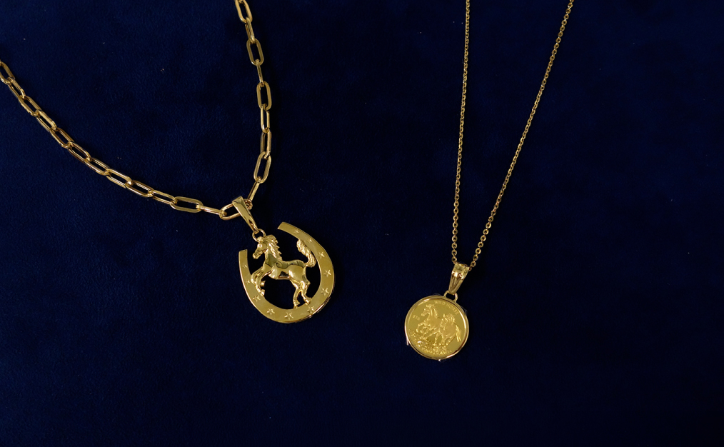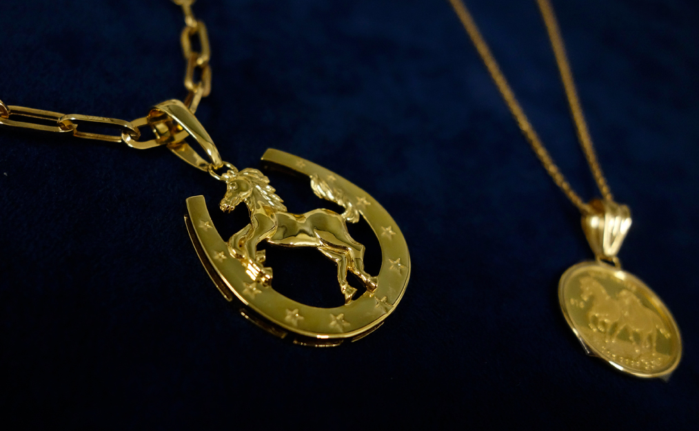 幅広・大振りのチェーンにも対応可能なペンダントトップ。通すチェーンによって違った雰囲気をお楽しみいただけます。馬蹄(K18)コイン(K18/K24)