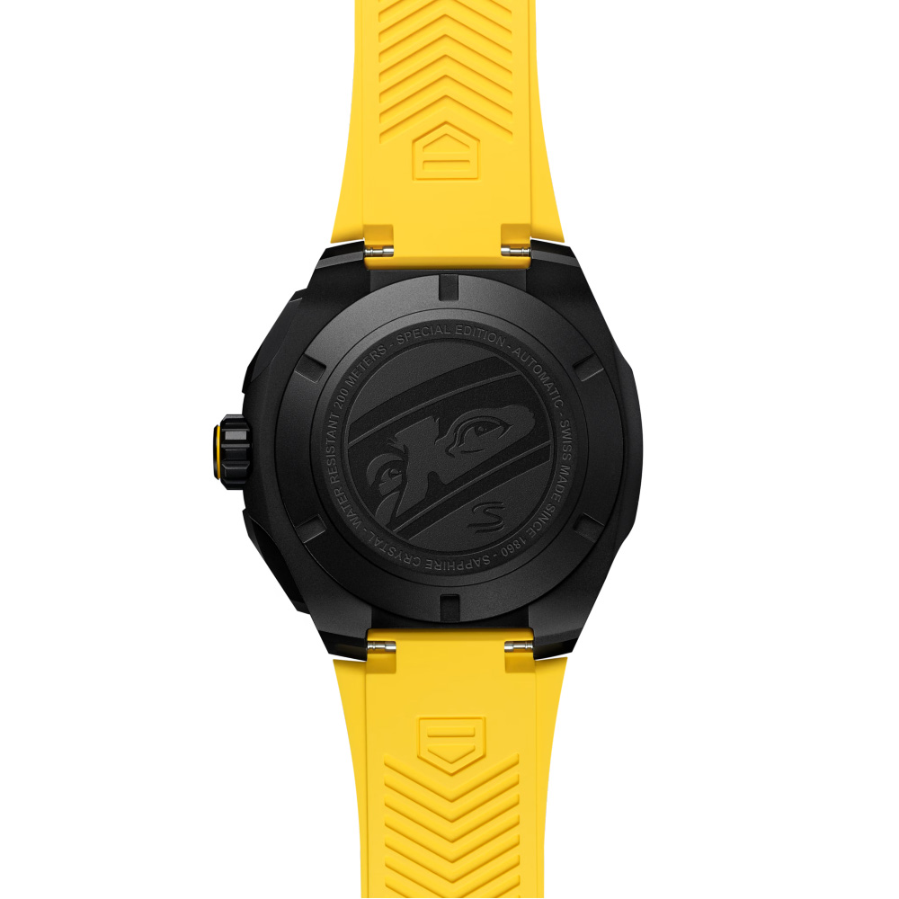 ケースバックには、彼が愛用していたヘルメットの刻印が施されています。
