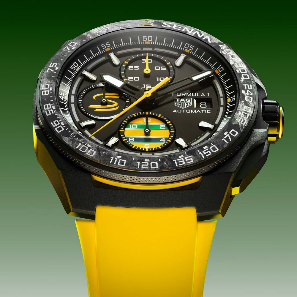 超高速のモーターレーシングで求められる要件を満たすよう設計された44mmのブラックDLCチタン製ケースとフォージドカーボン製ベゼルが、耐久性と軽量感の両立を見事に実現。ベゼルに刻まれた「アイルトン・セナ」氏のロゴが、アイコニックなパートナーシップを強調し、限界を超えるインスピレーションをもたらします。