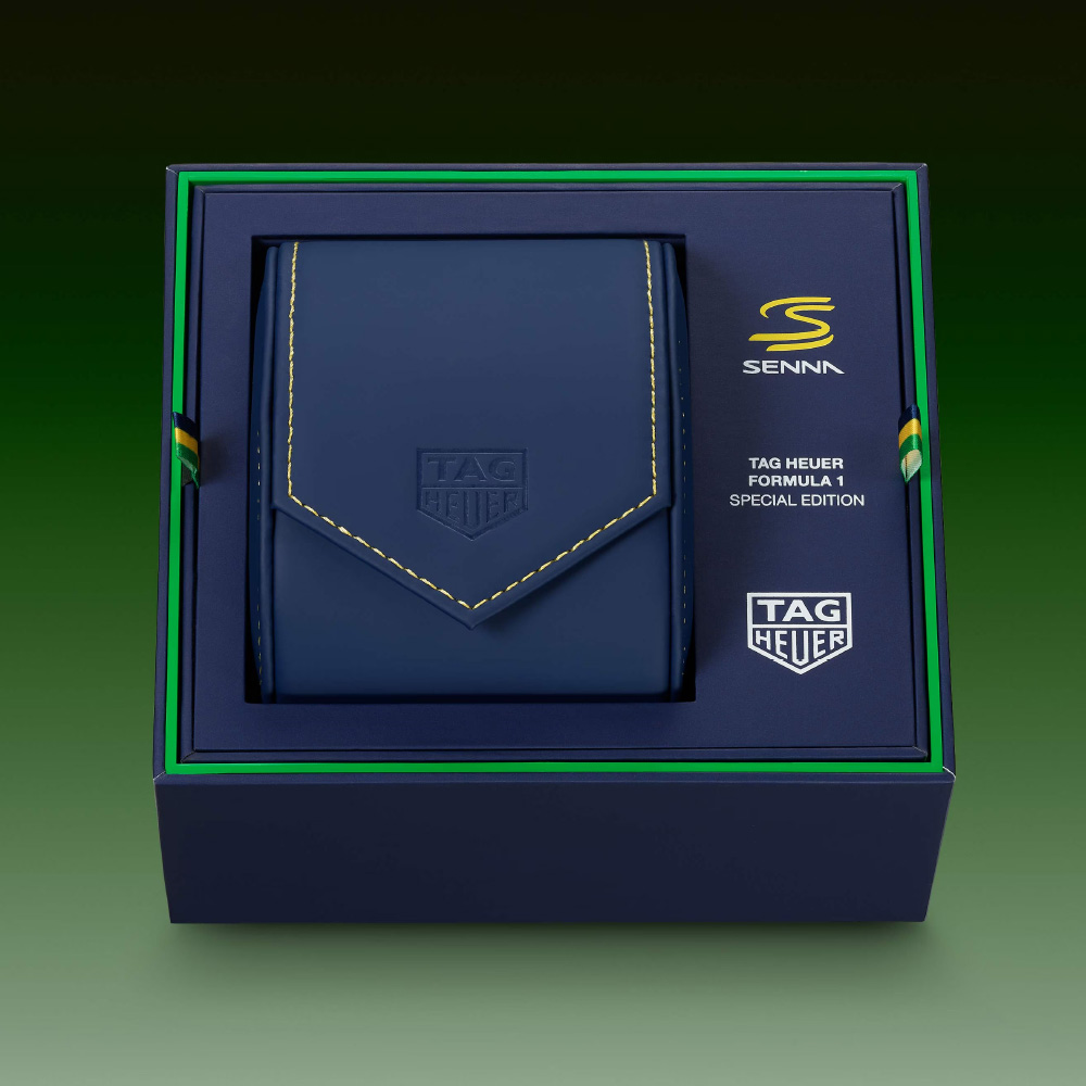 また、ディープブルーにグリーンとイエローのディテールを合わせたスペシャルボックスが付属。「アイルトン・セナ」氏のヘルメットのカラーにトリビュートを捧げるデザインになっています。